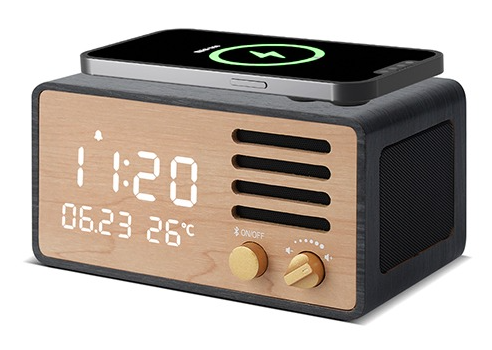 [우드쇼] Y129 블루투스 스피커 15W 고속 무선충전시계_블랙우드